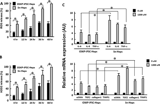 Long-term treatment of exogenous fatty acids led to the production of reactive oxygen species (ROS) and hydrogen peroxide in a time-dependent manner in both hepatocytes, and the production of both oxidative substances were significantly lower in OSKP-iPSC-Heps than that in Sn-Heps (Figure 3A and 3B). Such exogenous fatty acids also elicited a robust mRNA upregulation of several pro-inflammatory cytokines (IL-6, IL-8 and TNF-α; Figure 3C, upper) and fibrosis-associated genes (α-SMA, TGF-β, Collagen1 and Tissue inhibitor of metalloproteinase 1 (TIMP1); Figure 3C, lower) in Sn-Heps, whereas the upregulation of both pro-inflammatory genes and fibrosis-associated genes were restricted in OSKP-iPSC-Heps (Figure 3C). Taken together, these findings demonstrated that OSKP-reprogrammed iPSCs were capable of differentiation into functional hepatocyte-like cells that were less susceptible to exogenous fatty acid challenge than Sn-Heps. The low susceptibility of OSKP-iPSC-Heps to exogenous fatty acids was probably due to the suppressive effect on oxidative substances.