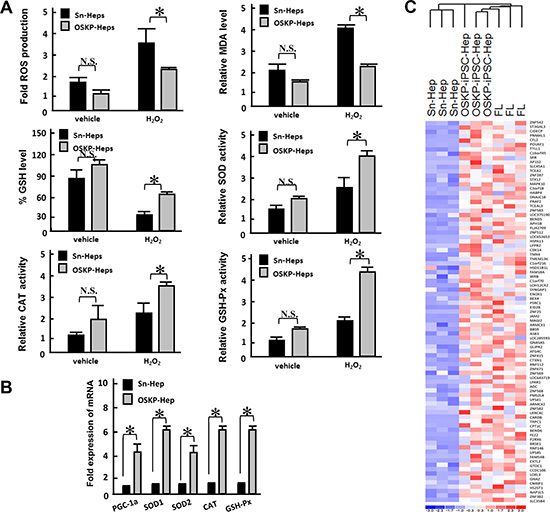 Figure 4: Resistance of OSKP-iPSC-Heps to oxidative insults (A) Effect of H2O2 challenge on the production of ROS (Upper left), malondialdehyde (Upper right), glutathione (Middle left), and the enzyme activity of antioxidant enzymes SOD (Middle right) and CAT (Lower left) and GSH-Px (Lower right) in OSKP-iPSC-Heps and Sn-Heps. (B) Quantitative RT-PCR showing the expression of antioxidant genes PGC-1α, SOD1, SOD2, Catalase, and GSH-Px in OSKP-iPSC-Heps and Sn-Heps. (C) Gene expression microarray analysis showing the expression profile among OSKP-iPSC-Heps, Sn-Heps and fetal livers. The predominant upregulated processes in OSKP-iPSC-Heps included those related to the antioxidant enzyme system. In Panels A and B, *P < 0.05 vs. Sn-Heps.