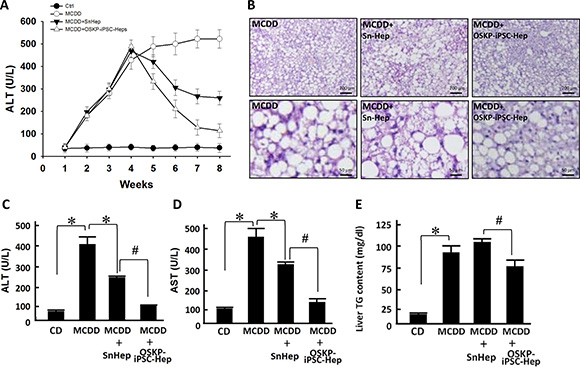 Figure 5: Transplantation of OSKP-iPSC-Heps alleviated steatohepatitis in 18-month-old male MCD diet-fed mouse. (A) Time course of the changes in serum ALT levels among control diet-fed mice, MCDD-fed mice, and MCDD-fed mice with intrasplenic transplantation of OSKP-iPSC-Heps or SnHeps. (B) H & E staining showing the fat accumulation and severe hepatocyte vacuolization over the liver from MCDD-fed mice. Effect of intrasplenic transplantation of OSKP-iPSC-Heps or SnHeps on serum (C) ALT and (D) AST levels, and (E) hepatic triglyceride accumulation in MCDD-fed mice. In Panels C, D and E, *P < 0.05 vs. MCDD; #P < 0.05 vs. MCDD+SnHep.