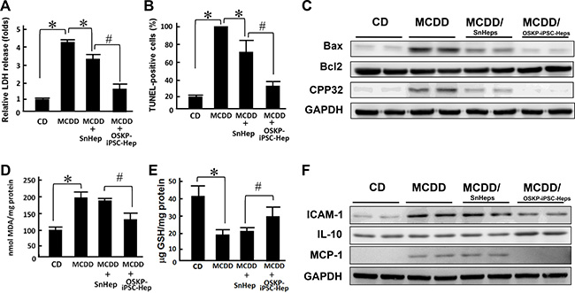 Figure 6: Transplantation of OSKP-iPSC-Heps alleviated the production of oxidative substances and cell apoptosis. Effect of intrasplenic transplantation of OSKP-iPSC-Heps or SnHeps on (A) the release of LDH and (B) the numbers of hepatic apoptotic cells. (C) Western blotting showing the protein expression of Bax, Bcl2, and CPP32 in MCDD-fed mice with intrasplenic transplantation of OSKP-iPSC-Heps or SnHeps. Effect of intrasplenic transplantation of OSKP-iPSC-Heps or SnHeps on the hepatic content of (D) malondialdehyde and (E) GSH. (F) Western blotting showing the protein expression of ICAM, IL-10, and MCP-1 in MCDD-fed mice with intrasplenic transplantation of OSKP-iPSC-Heps or SnHeps. In Panels A, B, D and E, *P < 0.05 vs. MCDD; #P < 0.05 vs. MCDD+SnHep.