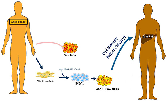 Figure 7: Scheme for the generation of OSKP-iPSC-Heps from aged donor-derived somatic cells. Scheme illustrates the feasibility of generation of OSKP-iPSC-Heps from aged donor-derived somatic cells. Such iPSC-based cell therapy may provide better efficacy than senescent primary hepatocytes.