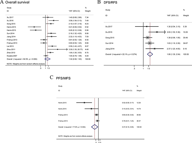 Figure 2: Forest plots of merged analyses for survival associated with TRIM29 expression. Notes: (A) Forest plot to assess the OS analysis; (B) Forest plots for the DFS/RFS analysis; (C) Forest plots of PFS/MFS analysis. Abbreviation: OS, overall survival; RFS, recurrence-free survival; DFS, disease-free survival; PFS, progression-free survival; MFS, metastasis-free survival; HR, Hazard ratio.