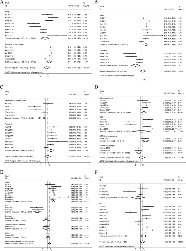 Figure 3: Forest plots of merged analyses for OS associated with TRIM29 expression. Notes: (A) Forest plots for the subgroup analysis in different tumor types; (B) Forest plots for the subgroup analysis in different ethnicities; (C) Forest plots for the subgroup analysis in different data sources; (D) Forest plots for the subgroup analysis in different pathological types; (E) Forest plots for the subgroup analysis in different nationalities; (F) Forest plots for the subgroup analysis in different methods. Abbreviations: HR, Hazard ratio; SCC, squamous cell carcinoma; qRT-PCR, quantitative reverse transcription polymerase chain reaction; IHC, immunohistochemistry.