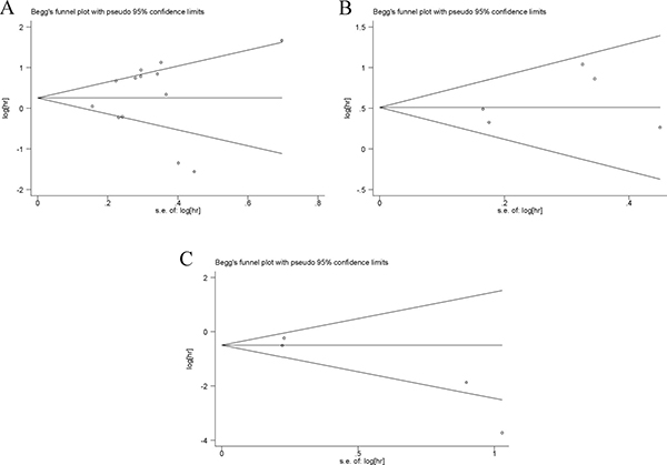 Figure 4: Begg’s funnel plots of the publication bias. Notes: (A) Begg’s funnel plots of the publication bias for overall merged analysis of OS. Each point represents a separate study. (B) Begg’s funnel plots of the publication bias for overall merged analysis of DFS/RFS. (C) Begg’s funnel plots of the publication bias for overall merged analysis of PFS/MFS. Abbreviations: OS, overall survival; RFS, recurrence-free survival; DFS, disease-free survival; PFS, progression-free survival; MFS, metastasis-free survival.