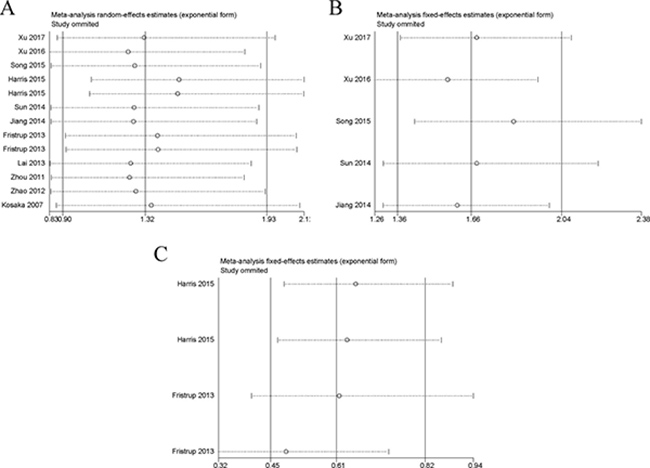 Figure 5: Sensitivity analysis of each included study. Notes: (A) Sensitivity analysis of OS for individual studies. (B) Sensitivity analysis of DFS/RFS for individual studies. (C) Sensitivity analysis of PFS/MFS for individual studies. Abbreviations: OS, overall survival; RFS, recurrence-free survival; DFS, disease-free survival; PFS, progression-free survival; MFS, metastasis-free survival.
