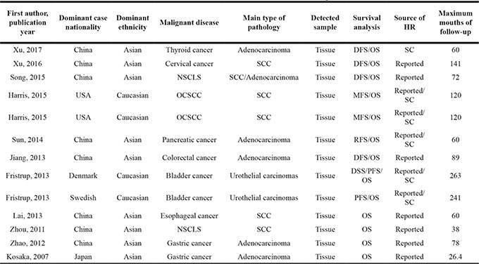 The main features of the 13 eligible data are summarized in Table 1 and Table 2. The data collected from the 13 cohorts that included a total of 2046 participants were ultimately included in the meta-analysis. The malignant neoplasms assessed in these studies included cervical cancer, non-small cell lung cancer (NSCLS), oral cavity squamous cell carcinoma, pancreatic cancer, colorectal cancer, bladder cancer, esophageal squamous cell carcinoma, gastric cancer and thyroid carcinoma. Immunohistochemistry (IHC) staining was used to measure TRIM29 expression in 10 studies, while the remaining study used quantitative reverse transcription polymerase chain reaction (qRT-PCR). The pathological types comprised adenocarcinoma, squamous cell carcinoma (SCC) and urothelial carcinoma. These studies were all retrospective in design.