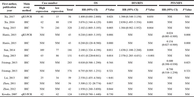 OS, overall survival; DFS, disease-free survival; MFS, metastasis-free survival; RFS, recurrence-free survival; PFS, progression-free survival; DSS, disease-specific survival; NSCLC, non-small cell lung cancer; OCSCC, oral cavity squamous cell carcinoma; SCC, squamous cell carcinoma; HR, hazard ratio; IHC, Immunohistochemistry; qRT-PCR, quantitative reverse transcription polymerase chain reaction; NM: not mentioned; CI, confidence interval; TRIM29, tripartite motif-containing protein 29.