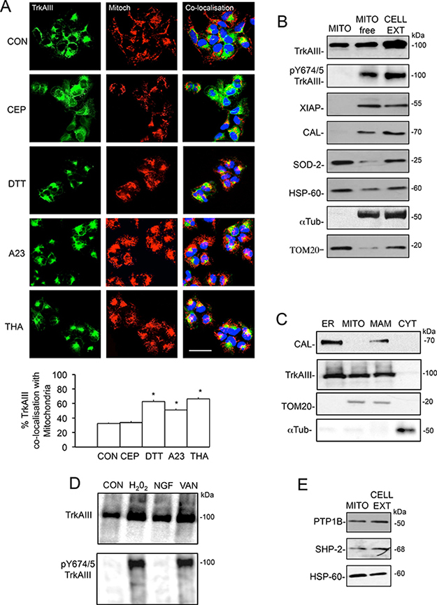 Figure 2: Mitochondrial TrkAIII is inactive under non-stress conditions. (A) IF micrographs demonstrating TrkAIII expression (green), MitoTracker Red-labelled mitochondria (red) and TrkAIII-mitochondria co-localisation (yellow) in untreated TrkAIII SH-SY5Y cells (CON) and in TrkAIII SH-SY5Y cells treated with CEP-701 (CEP, 100nM), DTT (5 mM), A23187 (A23, 10 μM) and thapsigargin (THA, 10 ng/ml) for 3 hours (bar = 50 μM), plus a histogram demonstrating quantitated differences in TrkAIII co-localisation with mitochondria under the same conditions. Results are displayed as the mean (± s.e.) percentage co-localisation per cell, in 50 cells per group (* = statistical significance). (B) Western blots demonstrating levels of total TrkAIII (TrkAIII), Y674/675 phosphorylated TrkAIII (pY674/5 TrkAIII), XIAP, calnexin (CAL), SOD-2, HSP-60, α-tubulin (α-Tub) and TOM20 in mitochondria (MITO), mitochondria-depleted cell extracts (MITO-free) and total cell extracts (CELL EXT) from TrkAIII SH-SY5Y cells (20 μg per lane). (C) Western blots demonstrating TrkAIII and calnexin (CAL) but not TOM-20 or α-tubulin in purified ER membranes; TrkAIII and TOM20 but not calnexin or α-tubulin in purified mitochondria; TrkAIII, calnexin (CAL) and TOM20 but not α-tubulin (α-Tub) in purified MAMs; and α-tubulin but not TrkAIII, calnexin or TOM20 in membrane-free cytosol (CYT) from TrkAIII SH-SY5Y cells (20 μg/lane). (D) Western blots demonstrating the induction of mitochondrial TrkAIII Y674/675 phosphorylation (pY674/5TrkAIII), following 15-minute incubation with H2O2 and sodium orthovanadate (VAN) but not with NGF (20 μg/lane). (E) Western blots demonstrating the presence of PTP1B, SHP-2 and HSP60 in purified mitochondria and whole cell extracts from TrkAIII SH-SY5Y cells (20 μg/lane, right panels).