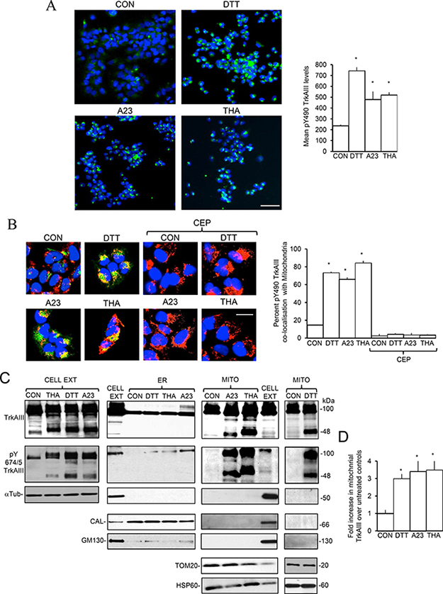 Figure 3: ER stress-induces Mitochondrial Importation and TrkAIII cleavage-activation. (A) IF micrographs demonstrating increased levels of TrkAIII Y490 phosphorylation (green) in TrkAIII SH-SY5Y cells treated with DTT (5 mM), A23187 (A23, 10 μM) and thapsigargin (THA, 10 ng/ml) for 3 hours compared to untreated control (CON) (bar = 100 μm, nuclei are stained with DAPI) plus a histogram demonstrating quantitative differences in the levels of Y490 phosphorylated TrkAIII (pY490TrkAIII), under these conditions. Results are displayed as the mean (± s.e.) densitometric levels of Y490 phosphorylated TrkAIII per cell, in 50 cells per group. (B) IF micrographs demonstrating marked increase in Y490 phosphorylated TrkAIII (green) co-localisation (yellow) with MitoTraker red-stained mitochondria (red) in TrkAIII SH-SY5Y cells treated with DTT (5 mM), A23187 (A23, 10 μM) and thapsigargin (THA, 10 ng/ml) for 3 hours, compared to untreated control (CON) (left 4 panels) and the complete abrogation of TrkAIII Y490 phosphorylation in TrkAIII SH-SY5Y cells pre-incubated with CEP-701 (100 nM) for 3 hours prior to treatment with DTT (5 mM), A23187 (A23, 10 μM) and thapsigargin (THA, 10 ng/ml) for 3 hours, and in untreated controls (CON) (right 4 panels) (bar = 10 μm) plus a histogram demonstrating the differences in percentage Y490 phosphorylated TrkAIII (pY490TrkAIII) co-localisation with mitochondria under these conditions. Results are displayed as the mean (± s.e.) percentage co-localisation per cell, in 20 cells per group (* = statistical significance). (C) Western blots demonstrating the effect of TrkAIII SH-SY5Y treatment with DTT (5 mM), A23187 (A23, 10 μM) and thapsigargin (THA, 10 ng/ml) for 6 hours on total TrkAIII and Y674/5 phosphorylated (pY674/5 TrkAIII) in purified α-tubulin positive total cell extracts (CELL EXT), purified calnexin (CAL) positive, GM130 depleted, α-tubulin (αTub) negative ER membranes and purified TOM20 and HSP60 positive, GM130 and calnexin (CAL) negative mitochondria compared untreated controls (CON) (20 μg/lane). (D) Histogram demonstrating increased levels of mitochondrial TrkAIII (full length plus cleaved), following treatment with DTT (5 mM), A23187 (A23, 10 μM) and thapsigargin (THA, 10 ng/ml) for 6 hours, compared to untreated controls (CON). Results are displayed as the mean (± s.e.) fold increase over controls, in 4 independent Western blots, normalised with respect to HSP60 (* = statistical significance).