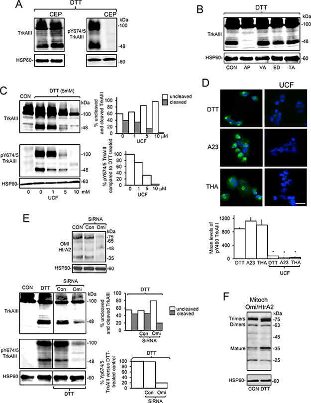 Figure 6: ER stress induced activation of mitochondrial TrkAIII is Omi/HtrA2-mediated and cleavage-dependent. (A) Western blot demonstrating CEP-701 (CEP, 100 nM, 3 hour pre-incubation) inhibition of DTT-induced (5 mM for 6 hours) TrkAIII Y674/675 phosphorylation (pTrkAIII) but not cleavage (TrkAIII) in mitochondria from TrkAIII SH-SY5Y cells (20 μg/lane). (B) Western blot demonstrating the inhibition of DTT-induced (5mM for 6 hours) TrkAIII cleavage (TrkAIII) by aprotinin (10 μM, AP) but not by z-VAD-fmk (10 μM, VA) EDTA (1mM, ED) or TAPI-2 (100μM, TA) in mitochondria from TrkAIII SH-SY5Y cells (20 μg/lane). (C) Western blots showing dose-dependent Ucf-101 (UCF, 0-10 μM) inhibition of DTT-induced (5 mM for 6 hours) cleavage (TrkAIII) and Y674/675 phosphorylation (pY674/5 TrkAIII) of TrkAIII in mitochondria from TrkAIII SH-SY5Y cells. HSP60 levels are displayed as loading controls (20 μg/lane), plus a histogram demonstrating densitometric quantification of the adjacent Western blots. (D) IF micrographs demonstrating Ucf-101 (UCF 10 mm) inhibition of TrkAIII Y490 phosphorylation induced by DTT (5 mM), A23187 (A23, 10 μM) and thapsigargin (THA, 10 ng/ml) (3 hour-treatment) (bar = 50 μM) plus a histogram demonstrating densitometric quantification of Ucf-101 inhibition of DTT-induced Y490TrkAIII phosphorylation. Results are displayed as the mean (± s.e.) level of Y490 phosphorylated TrkAIII per cell, 20 cells per group (* = statistical significance). (E) Western blots demonstrating knockdown of Omi/HtrA2 by Omi/HtrA2-specific (Omi siRNA) but not control siRNAs (Con SiRNA) (upper panels), relative to HSP60 in mitochondria from TrkAIII SH-SY5Y cells (20 μg/lane). Western blots demonstrating reduction in both DTT-induced mitochondrial TrkAIII cleavage (TrkAIII) (middle panels) and Y674/5 phosphorylation (pY674/5 TrkAIII) (bottom panels) compared to HSP60 levels, following siRNA Omi/HtrA2 knockdown but not in control siRNA-treated cells (Cont siRNA) (20 μg/lane) plus histograms demonstrating densitometric quantification of the reduction in DTT-induced TrkAIII cleavage and Y674/5 tyrosine phosphorylation following Omi siRNA knockdown. Results are displayed as the percentage change in un-cleaved and cleaved TrkAIII and percentage change in Y674/5 phosphorylation with respect to controls. (F) Western blot demonstrating increased levels of polymerised and mature OMI/HtrA2 in mitochondria purified from DTT-treated (5 mM for 6 hours) compared to untreated (CON) TrkAIII SH-SY5Y cells (20 μg/lane).