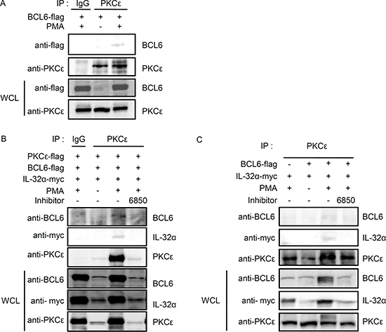 Figure 2: IL-32α interacts simultaneously with BCL6 and PKCε in the presence of PMA. (A) HEK293 cells were transfected with FLAG-tagged BCL6. Cells were incubated overnight then treated with 50 nM PMA for 3h. (B) HEK293 cells were cotransfected with vectors expressing FLAG-tagged BCL6, FLAG-tagged PKCε, and Myc-tagged IL-32α. After cotransfection, HEK293 cells were treated with the pan-PKC inhibitor, Gö6850 (6850; 10 μM), for 2 h followed by 50 nM PMA for 6 h. (C) The interactions were also observed between endogenous PKCε, IL-32α, and BCL6. HEK293 cells were cotransfected with FLAG-tagged BCL6 and Myc-tagged IL-32α as indicated. HEK293 cells were pretreated with a pan-PKC inhibitor, Gö6850 (6850; 10 μM), for 2 h then treated with 50 nM PMA for 6 h. Immunoprecipitations with 1 μg of anti-PKCε or normal IgG antibody were performed, and the precipitated IL-32α and BCL6 was detected. Immunoprecipitation with normal rabbit IgG antibodies (IgG) was used as a control.