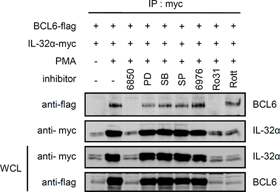 Figure 3: The interaction between IL-32α and BCL6 is mediated by PMA-activated PKCε. HEK293 cells were cotransfected with a Myc-tagged IL-32α expression vector and FLAG-tagged BCL6. The transfected cells were pretreated with various inhibitors. Cells were treated with the pan-PKC inhibitor, Gö6850 (6850; 10 μM); ERK inhibitor, PD98059 (PD; 25 μM); p38 inhibitor, SB203580 (SB; 10 μM); classical PKC inhibitor, Gö6976 (6976; 10 μM); PKCε inhibitor, Ro-31-8220 (Ro31; 10 μM); and PKCδ inhibitor, Rottlerin (Rott; 10 μM), for 2 h, then with 50 nM PMA for an additional 3 h. Immunoprecipitation was performed with 1 μg of anti-myc tag antibody. Anti-flag antibody was used to detect BCL6 interacting with IL-32α.