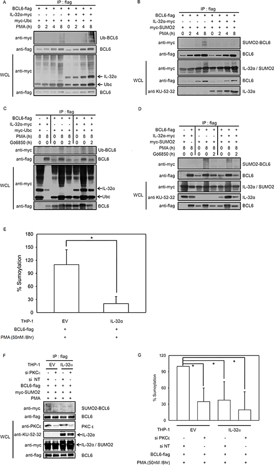 Figure 4: IL-32α mediates selection between ubiquitin or SUMO-2 conjugation to BCL6. (A) Expression constructs encoding Myc-tagged ubiquitin (2 μg) and FLAG-tagged BCL6 (1 μg) were cotransfected into HEK293 cells with or without the IL-32α expression vector (0.5 μg). After overnight incubation, transfected cells were incubated with PMA (50 nM) for the given time before harvest. Cell extracts were subjected to immunoprecipitation and immunoblotting carried out as described. Ubiquitin-modified BCL6 is indicated by trailing bands. (B) HEK293 cells were cotransfected with plasmids expressing Myc-tagged SUMO-2 (2 μg) and FLAG-tagged BCL6 (1 μg) in the presence or absence of an IL-32α expression plasmid (0.5 μg), and immunoprecipitation experiments were performed as described in (A). (C and D), The experiments described in (A) and (B) were repeated, now using the pan-PKC inhibitor, Gö6850. Transfected cells were preincubated with pan PKC inhibitor, Gö6850 (6850; 10 μM) for 2 h followed by 50 nM PMA for 8 h. (E) THP-1-IL-32α and THP-1 EV were transfected with a construct expressing FLAG-tagged BCL6 with or without Myc-tagged SUMO-2 expression vector. After overnight incubation, THP-1 cells were treated with 50 nM PMA for 8 h, and then SUMO-2 conjugated BCL6 was detected in cell lysates with an in vivo SUMOylation ELISA, as described in Materials and Methods. (F and G), THP-1-IL-32α and THP-1 EV were transfected with a construct expressing FLAG-tagged BCL6, with or without a Myc-tagged SUMO-2 expression vector, and PKCε siRNA (siPKCε) or nontargeting siRNA (siNT) (100 nM). SUMOylation ELISA assay was performed in the same way. All data represent the mean ± SD of more than three independent experiments. *p<0.05.