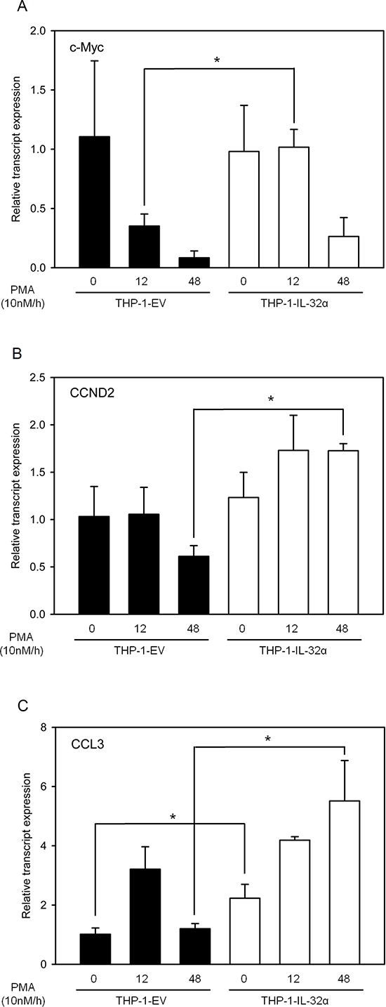 THP-1 EV and THP-1-IL-32α cells were treated with 10 nM PMA for the indicated time, and total RNA was extracted for RT-PCR. Total RNA was extracted using the Easy-Blue total RNA extraction kit (iNtRon Biotechnology, Seoul, Korea). For cDNA synthesis, reverse transcription was performed with 2 μg of the total RNA, oligo dT, dNTPs, DTT, buffer and Superscript M-MuLV reverse transcriptase (New England Biolabs, Beverly, MA). cDNA was analyzed by real-time qPCR using iQ SYBR Green Supermix (both from BioRad, Hercules, CA) according to the manufacturer's instructions for relative quantification by using Chromo 4 (Bio-Rad, Hercules, CA). Target gene expressions were normalized to that of the housekeeping gene, GAPDH. Primers sets were as follows: c-Myc: sense 5′-TCA AGA GGC GAA CAC ACA AC-3′, antisense 5′-GGC CTT TTC ATT GTT TTC CA-3′; CCND2: sense 5′-CCG GAC CTA ATC CCT CAC TC-3′, antisense 5′-CAC ACC GAT GCA GCT TTC TA-3′; and CCL3: sense 5′-GGT CTC CAC TGC TGC CCT TGC-3′, antisense 5′-GGA ATC TGC CGG GAG GTG TAG C-3′.