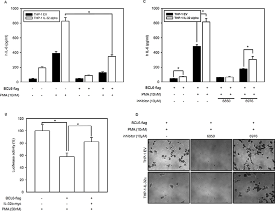Figure 6: IL-32α induces IL-6 production by inhibiting BCL6. (A) FLAG-tagged BCL6 was transfected into THP-1 EV and THP-1-IL-32α cells as indicated. After overnight incubation, cells were treated with 10 nM PMA for 24 h. Culture supernatants were measured by ELISA for IL-6 secretion. (B) HEK293 cells were transfected with vectors for an IL-6 promoter-firefly luciferase reporter plasmid (as previously reported [13], 0.5 μg) and a plasmid expressing PKCε (1 μg) in the absence or presence of a BCL6 vector (1 μg) and IL-32α-expressing vector (1 μg), as described. After overnight incubation, cells were further incubated with 50 nM PMA for 24 h. The cell lysate was then subjected to a dual-luciferase assay. Results are presented as percent activity relative to the activity in cells transfected with neither IL-32α nor BCL6 (set a 100%). Data (mean and SEM.) are representative of at least six independent experiments. (C) THP-1 EV and THP-1-IL-32α cells were transfected with BCL6. These cells were pretreated with Gö6850 (6850; 10 μM) or Gö6976 (6976; 10 μM) for 2 h. followed by treatment with PMA of 10nM for 24 h. (D) BCL6 expressing THP-1 EV and THP-1-IL-32α cells were pretreated with the inhibitors Gö6850 (6850; 10 μM) or Gö6976 (6976; 10 μM) for 2 h. and incubated for another 48 h with 10 nM PMA. Cell adhesion and morphology were analyzed using phase-contrast microscopy.