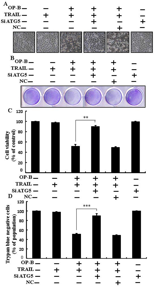 Figure 5: Ophiopogonin B sensitized TRAIL-initiated apoptosis is encloseed by genetic attenuation of autophagy flux. A549 cells were pre-incubated with ATG5 siRNA or negative control siRNA for 24 h and then exposed to indicated Ophiopogonin B (10 μM) doses for 12 h with or without TRAIL protein for an additional 2 h. (A) Cell morphology photographed using light microscope (×100); (B) Cell viability was measured with crystal violet assay; (C) Bar graph indicating average density of crystal violet; (D) Cell viability was assessed with trypan blue dye exclusion assays.**p < 0.01, ***p < 0.001:represent significant differences between control and each treatment group. OP-B: Ophiopogonin B; TRAIL: Tumor necrosis factor (TNF)-related apoptosis-inducing ligand; siATG5: ATG5 small interfering RNA; NC: Negative control.