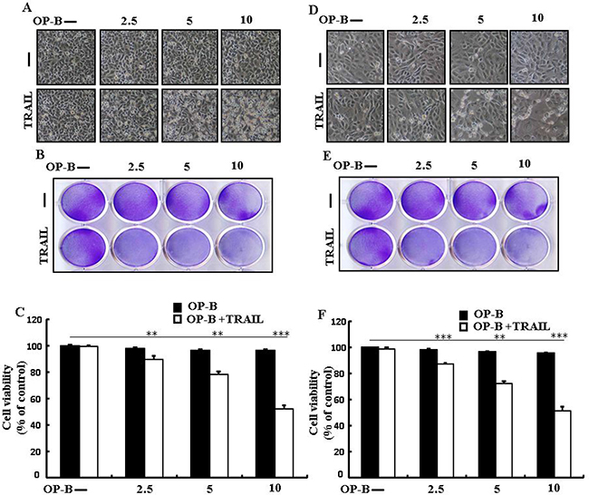 Figure 1: Ophiopogonin B sensitizes TRAIL-initiated apoptosis in A549cells. A549cells were pre-incubated with Ophiopogonin B at different doses (0, 2.5, 5, and 10 μM) for 12 h and exposed to TRAIL protein 200 ng/ml for 2 h. (A) Cell morphology photographed using light microscope (×100); (B) Cell viability was measured with crystal violet assay; (C) Bar graph indicating the average density of crystal violet; (D) Cell viability was assessed with trypan blue dye exclusion assays. **p < 0.01, ***p < 0.001: represent significant differences between control and each treatment group; OP-B: Ophiopogonin B; TRAIL: Tumor necrosis factor (TNF)-related apoptosis-inducing ligand.