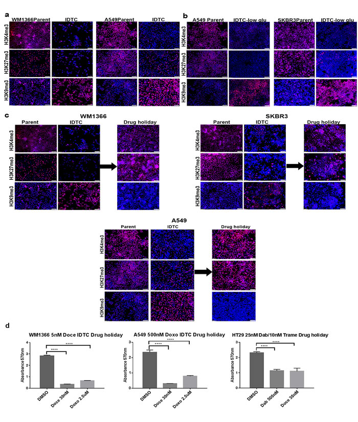 Figure 2: Stress and drug holidays dynamically modulate histone modifications. a. WM1366, A549 IDTCs and their parental cells were tested for H3K4me3, H3K9me3 and H3K27me3 antibodies by IF. Representative antibodies staining and Hoechst (nuclear) staining were taken separately and overlaid picture are shown. b. A549 and SKBR3 cells were cultured with 1mg/ml glucose containing media for at least 12 days. Media was replenished after every three days. IF was performed for the indicated Abs to compare to parent cells supplemented with 5mg/ml glucose media. c. WM1366, SKBR3 and A549 IDTCs were allowed a drug holiday for ten days. During this period of time, no drug was provided and media changed every 72 hrs. Histone modifications were analysed by IF with the indicated Abs compared to corresponding parental cells. (All of the IF image were taken at 10x Magnification and bar is 100µm long) d. After 10 days of drug holidays WM1366, A549 and HT29 IDTCs were exposed to toxic concentrations of doxorubicin (2.5µM), docetaxel (30nM) for WM1366, A549 and dabrafenib (500nM) and docetaxel (30nM) for HT29. Cell survival was analysed by MTT assay. All experiments were done in triplicate. Statistical analysis was performed by the one-way ANOVA test and P-value is represented as (*) where, ****P < 0.0001.