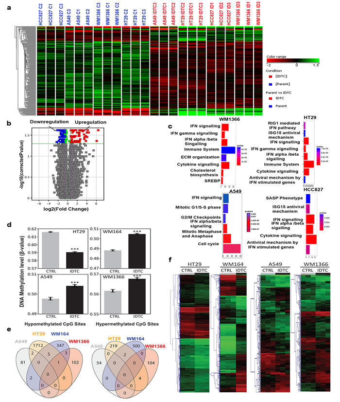 Figure 3: Differential expression of genes and genome wide DNA methylation in IDTCs compared to parental cells. a. Hierarchical clustering of differential gene expression. Four cancer cell lines were analysed by the Australian Genome Research Facility (AGRF) for genome-wide differential expression using Illumina expression arrays. An unbiased hierarchical clustering was developed using the Mann-Whitney unpaired test with a fold change cut off FC≥ 1.5 and P≤0.05 as shown in the figure. b. A volcano plot was generated with a similar threshold as mentioned above depicting the overall 293 up and down-regulated genes. c. Pathways enriched for each of the IDTCs compared to parent cells are shown by using cluster Profiler7, with a p-value and a q-value cut off of 0.1 and 0.05 respectively. Genome-wide DNA methylation analyses reveal cell type-specific changes at the IDTC state. d. DNA methylation levels of IDTCs compared to untreated control. Bars represent the mean DNA methylation level for each cell line, with (IDTC) and without (CTRL) treatment. Error bars = S.E.M. e. Venn’s diagrams representing commonly differentially methylated (hypo- or hyper-methylated) CpG sites in IDTCs compared to control. f. Hierarchical clustering for cell-type using differentially methylated CpG sites. Differentially methylated CpG sites between the groups were identified using the Rank Products test [54]. After 100 permutations, CpG sites showing an adjusted p-value<0.05 (q-value) were considered significant. Scale bar for beta values: Green = 0 Black = 0.5 and Red = 1.