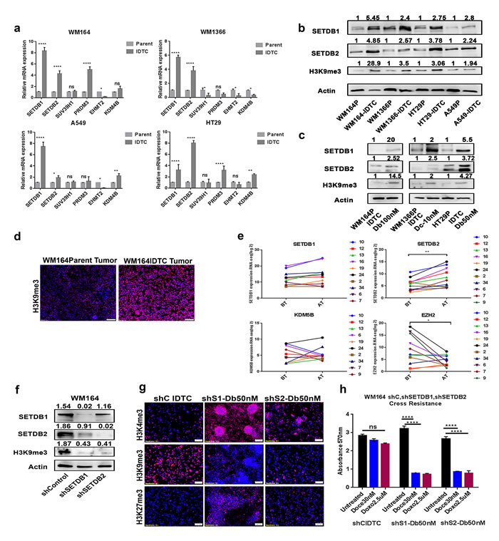 The increase in H3K9me3 prompted us to test for different known histone modifiers. H3K9me3 is catalysed by a set of specific histone methyltransferases and demethylases [24]. Our microarray data suggested the reciprocal up-regulation of methyltransferases and down-regulation of demethylases specific for H3K9me3 (Supplementary Table 2). Probing for SETDB1, SETDB2, EHMT2, SUV39H1, PRDM3, and KDM4B using qRT-PCR in WM164, WM1366, A549, and HT29 showed a consistent upregulation of SETDB1, SETDB2 and inconsistent changes in the expression of other histone modifiers in all IDTCs compared to their parental cells (Figure 5a). Higher expression of SETDB1, SETDB2 and H3K9me3 was confirmed at the protein level in four IDTC models representative of melanoma, lung and colon cancer (Figure 5b). Additionally, chronic exposure to dabrafenib and docetaxel at high concentrations led to a similar transition to the IDTC state involving SETDB1, SETDB2 and H3K9me3 up-regulation (Figure 5c). However, short exposure to dabrafenib, docetaxel, and doxorubicin for 72 hours did not induce SETDB1/2 and H3K9me3 which proposes that these changes are indeed features of the IDTC state (Supplementary Figure 8a). These observations suggest that increased expression of histone methyltransferases SETDB1 and SETDB2 stabilize H3K9me3 which is characteristic across different cancer types as a generic response towards stress. This in vitro increase of H3K9me3 was further confirmed in a melanoma xenograft model. Tumours generated by injecting 1x106 WM164 melanoma cells and treated with dabrafenib (10mg/Kg) and trametinib (0.1mg/Kg) after formation of tumours (200mm3) for 21 days, resembling the in vitro observations, showed an increase of H3K9me3 compared to control (Figure 5d, Supplementary Figure 8b). For further validation paired clinical specimens from melanoma patients treated with targeted therapies were analysed (Supplementary Table 3). RNA-seq data showed a significant up-regulation of SETDB2 after therapy and a decrease in EZH2, a methyltransferase of H3K27me3, with a trend towards increased SETDB1. KDM5B was either up- or downregulated (Figure 5e).