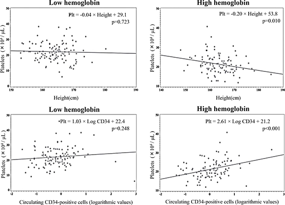 In conclusion, a significant inverse association was observed between height and platelet count, while a significant positive association was seen between platelets and circulating CD34-positive cells and CIMT in subjects with a high hemoglobin concentration, but not in those with a low hemoglobin concentration. These results indicate that among elderly Japanese men, those with a short stature activate vascular remodeling much more strongly compared to those with a tall stature.