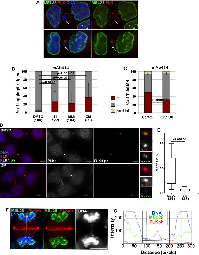 Figure 2: PLK1 and Aurora B regulate the loading of NPC. (A) HeLa cells were fixed and stained for MEL-28 and PLK1. The arrows indicate the lagging chromatin and absence of the NPC component. Scale bar 10 μm. (B) HeLa cells were treated with DMSO, BI 2536 (BI), MLN0905 (MLN), both targeting PLK1, or ZM447439 (ZM), targeting Aurora B, for 4 h then fixed and stained for mAb414. The lagging chromatin in telophase cells was analysed for presence or absence of the staining. The error bars indicate the SD between 3 replicates and Fisher exact test was used for statistical analyses. (C) HeLa cells were transiently transfected with mCherry:PLK1 (PLK1 OX) and fixed and stained for mAb414 24 h post-transfection. The graph shows the percentage of total micronuclei (MN) positive (brown) or negative (grey) for the staining. The error bars indicate the SD between 3 replicates and Fisher exact test was used for the statistical analyses. (D) HeLa cells were treated with either DMSO or ZM447439 (ZM) for 30 min then fixed and stained for PLK1 (red) or PLK1ph (green). Right panel zoom in of the staining at the midbody. Cells at the midbody stage were used for the analyses. Scale bar: 10 mm. (E) quantification of the experiment in (D). Signal intensity ratio between phosphorylated PLK1 and total PLK1 at the midbody in control (DMSO) and Aurora B inhibited (ZM) cells. Mann-Whitney U test was used for statistical analyses. (F) HeLa cells were stained for MEL28 (green) and PLK1ph (red). Anaphase cells showing absence of MEL28 staining on the lagging chromatin. The yellow line indicates the region used for the intensity profile in (G). (G) Intensity profile of the staining in (F) showing accumulation of MELS28 only when PLK1ph decreases.