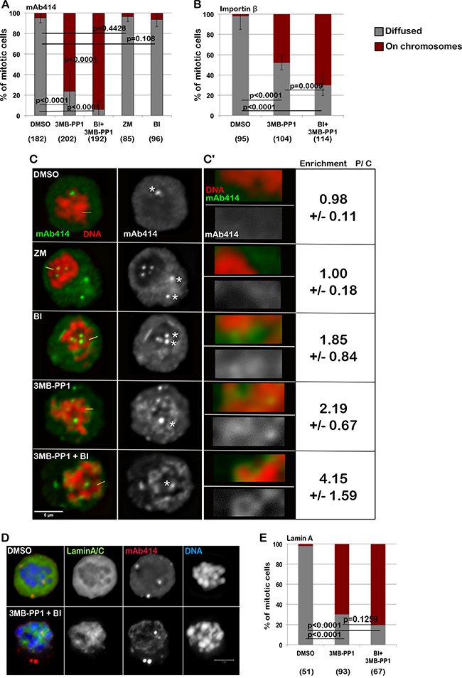 Figure 3: Inhibition of CDK1 and PLK1 in prometaphase cells are both required for the complete loading of the NPC and Importin β on the chromatin. (A–B) DT40CDK1AS were arrested in nocodazole for 4 h then treated for 15 min with DMSO, 3MB-PP1, ZM447439 (ZM), BI2536 (BI) or 3MB-PP1+BI2536 (BI+3MB-PP1). The cells were then stained either for mAb414 (A) or Importin β (B) and the localization of the staining was recorded. The data are presented as mean of 3 independent experiments. The error bars indicate the SD between 3 replicates and Fisher exact test was used for the statistical analyses. (C) representative images of the experiment shown in (A). The white asterisks indicate staining at the centrosomes (not considered in the analyses). C’: Enlargements of the pictures in (C). Enrichment of signal at the periphery of the chromosomes (P) over Cytoplasm (C) +/– SD is shown. mAb414 (green) and DNA (red). Scale bar 5 μm. (D) DT40CDK1AS were transiently transfected with GFP:LaminA and treated as in A. The localization of GFP:LaminA was recorded. The panels show representative images of cells treated only with DMSO (upper panels) or 3MB-PP1 + BI (bottom panels). (E) quantification of the experiment in (D). The data are presented as mean of 3 independent experiments. The error bars indicate the SD between 3 replicates and Fisher exact test was used for the statistical analyses.