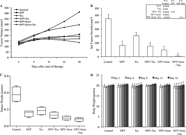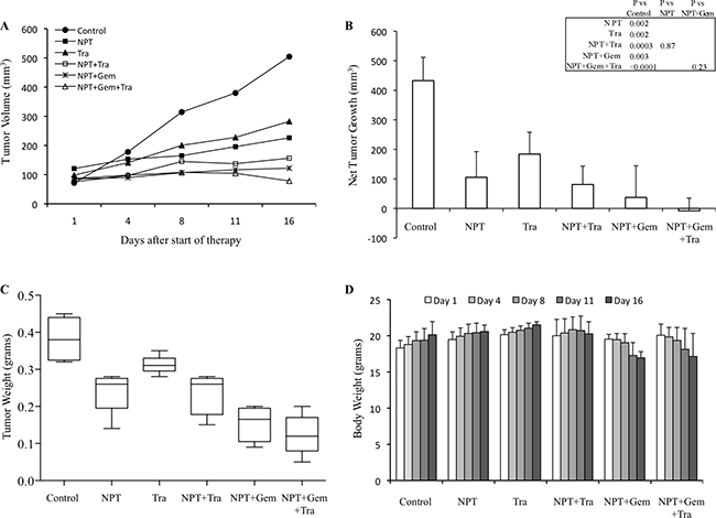 Figure 2: Antitumor activity of nab-paclitaxel-based chemotherapy regimens and trametinib in Panc-1 tumor xenografts. Panc-1 cells were subcutaneously injected in nude mice and treated with nab-paclitaxel-based chemotherapy regimens and trametinib for 2 weeks. (A) Tumor size as measured twice-weekly using calipers. (B) Net tumor growth, calculated by subtracting tumor volume on the first treatment day from that on the final day. (C) Mean tumor weight was calculated from final day tumor weights in each group and is presented as a Box plot. (D) Mouse body weight was measured twice a week and presented as bar chart for the 2-week therapy period. Data are representative of mean values ± standard deviation from 5 mice per group.