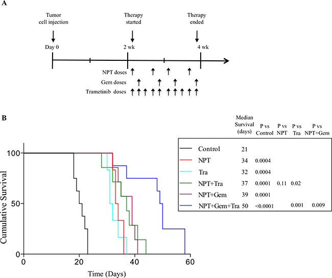 Figure 3: Prolongation of animal survival by nab-paclitaxel-based chemotherapy regimens and trametinib. (A) Schematic representation of experimental procedure. AsPC-1 cells (0.75 × 106) were injected intraperitoneally in NOD/SCID mice and treatment was started after 2 weeks with nab-paclitaxel, gemcitabine and trametinib for 2 weeks. (B) The curve represents the animal survival time from the beginning of therapy. Statistical group differences in survival time were calculated using logrank testing.