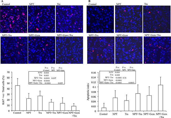 Figure 4: Mechanisms of antitumor activity of nab-paclitaxel-based chemotherapy regimens and trametinib. Nude mice were subcutaneously injected with AsPC-1 cells and treated with nab-paclitaxel, gemcitabine and trametinib for 2 weeks. (A) Intratumoral proliferation was measured by immunostaining tissue sections for Ki67 nuclear antigen. Ki67-positive cells were counted in five different high power fields. (B) Intratumoral apoptosis was measured by staining tumor tissue section with TUNEL procedure. TUNEL-positive apoptotic cells were counted in five different high power fields. For both immunostaining experiments, slides were photographed under a fluorescent microscope and the data are expressed as the mean ± standard deviation.