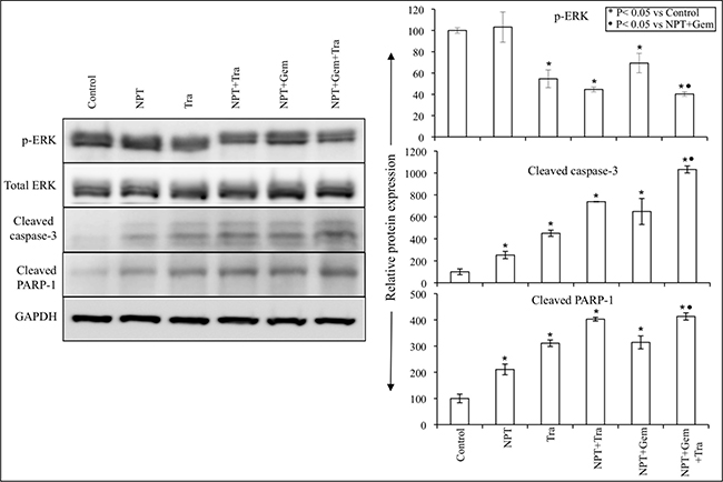 Further investigation of the tumor growth inhibitory action of nab-paclitaxel-based chemotherapy regimens and trametinib exhibited that trametinib significantly decreased ERK phosphorylation and concomitantly increased the expression of apoptosis-associated proteins cleaved caspase-3 and cleaved PARP-1 (Figure 5).