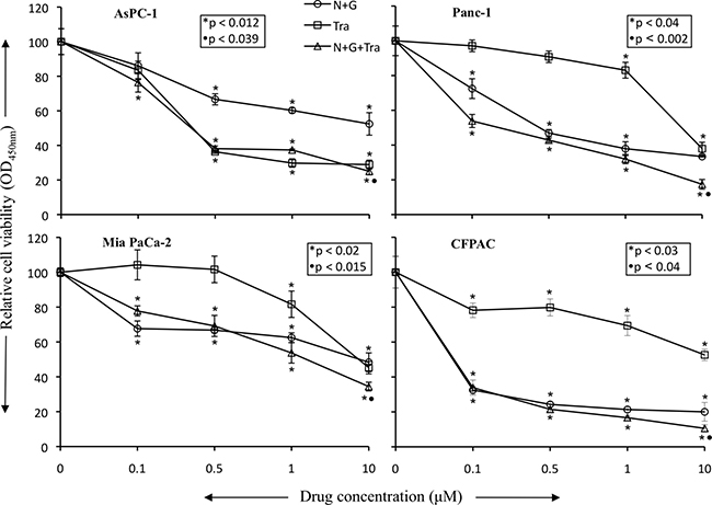 Figure 6: Nab-paclitaxel plus gemcitabine and trametinib inhibit in vitro PDAC cell proliferation. PDAC cells (AsPC-1, Panc-1, Mia PaCa-2, CFPAC) were plated on 96-well plates and treated with 100 nM to 10 μM concentrations of nab-paclitaxel, gemcitabine and trametinib. After 72 hours, 10 μl WST-1 reagent was added in each well and incubated for 2 additional hours. The absorbance at 450 nm was measured using a microplate reader. The resulting number of viable cells was calculated by measuring absorbance of color produced in each well. Data are the mean ± SD of triplicate determinations. The p values represent significance of the difference between the control and treated groups.