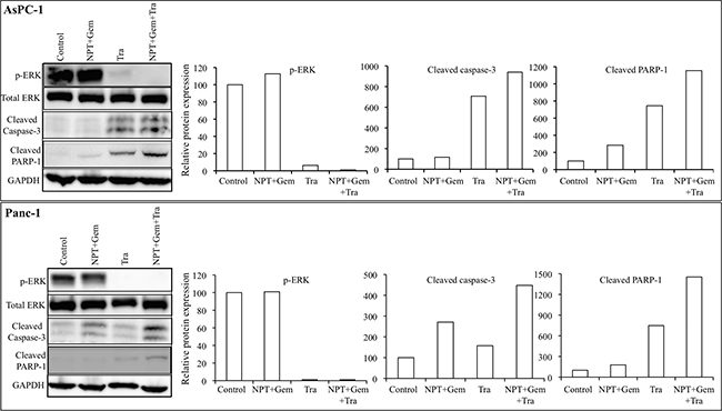 Figure 7: Nab-paclitaxel-based chemotherapy regimens and trametinib effects on their molecular targets in vitro. A sub-confluent monolayer of human PDAC cells AsPC-1 and Panc-1 was treated with nab-paclitaxel (10 μM), gemcitabine (10 μM) and trametinib (10 μM), either alone or in combination for 16 hours. Total cell extracts were analyzed by immunoblotting. The intensity of bands was quantitated by densitometry and is represented in the bar graph after normalizing values against corresponding total protein expression or GAPDH expression. Data are representative of two independent experiments with similar results.