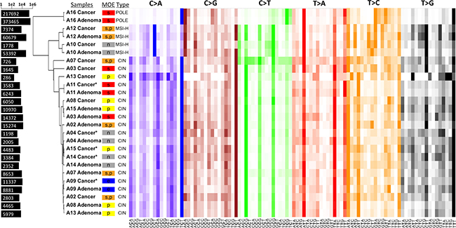 Figure 3: Heatmap of the mutational spectra analysis and hierarchical clustering of all cases. Each colored panel represent the 16 possible tri-nucleotide combinations corresponding to the respective transversion or transition type. The color intensity indicates the proportion of the particular tri-nucleotide for that substitution mutation. Bars on the left represent the total number of SNVs for each sample in log scale. Clearly visible linear pattern over all the samples with high color intensity suggests mutational components that are similar in the majority of cases. The samples are clustered into three major clusters with A16 samples being in one, A12 and A10 in another, and the rest in one cluster. A few samples, indicated by the asterisk, had too few cancer-specific mutations. For these samples, the somatic mutations included those found in the villous low adenoma stage. Stepwise MOEs are shown in red, parallel in yellow, the combination of two in orange, neutral in gray, and eruptive in blue.