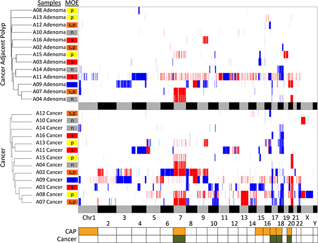 Figure 4: Heatmap of the CNA analysis and hierarchical clustering of the cases by adenoma and carcinoma. CNAs in each sample are indicated by either deletions (blue) or duplications (red). The alternating grey and black bars at the bottom of each panel represent the spanning of the chromosomes for regional reference. Samples are grouped together by similarity in pairwise CNA comparison using UPGMA and are labeled with the corresponding MOE. The bottom panel is the summary of chromosomes with the most recurrent changes. Chromosomes with significantly more recurrent changes in CAP are represented by the orange yellow color, and cancer by the olive green color. The stepwise MOEs are shown in red, parallel in yellow, the combination of two in orange, neutral in gray, and eruptive in blue.