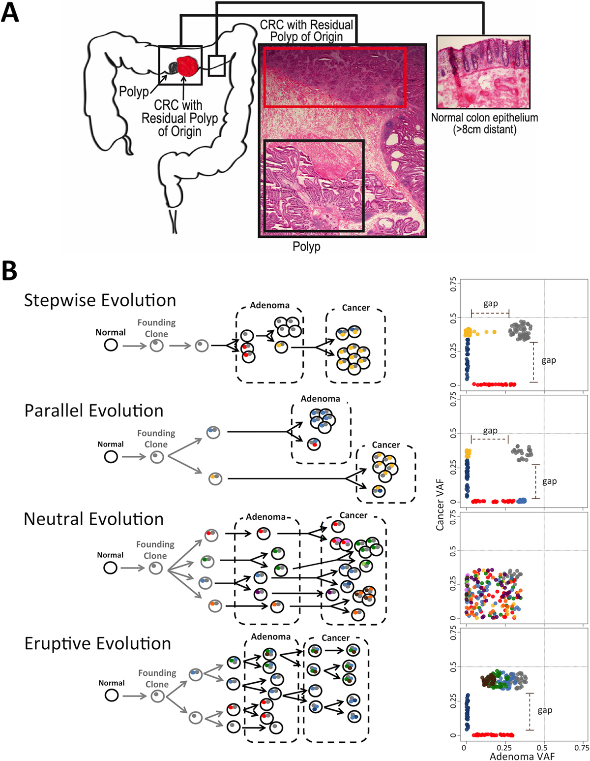 Figure 1: Modes of Evolution (MOE) in the transformation from adenoma to cancer and resulting AF distributions. (A) CRC with residual polyp of origin (top red box) refers to the cancer that has the polyp located physically adjacent to the cancer (bottom black box). (B) Schematic representation of MOEs in adenoma-to-cancer transformation: classical sequential stepwise evolution, parallel (branched) model, neutral evolution, and eruptive (Big-Bang) model of early bursts of single or whole chromosomal genomic disruption. Circles and dots depict cells and mutations respectively. Colors correspond to different clones/subclones. Plots on the right represent 2D AF distributions of somatic variants in polyps and cancer with dotted lines on 0.5 AF. AFs of shared SNVs could be shifted from 0.5 due to sample impurity. These distributions are characteristic of each mode and can be used for MOE prediction.