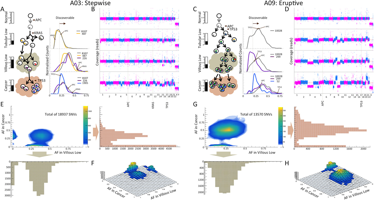 Let’s consider two cases of neoplastic transformation to CRC in our cohort: in case A03, where we classified MOE as stepwise, and in case A09, where we classified MOE as eruptive (Figure 2). In each patient, two stages of adenoma (tubular and villous) were observed, harvested, and sequenced. In these cases, the tubular and villous polyp along with the corresponding resultant cancer were in direct contiguity and present on the same histology slide, which likely represents the tissue compartments involved in the malignancy that patient A03 developed. Tubular adenoma in A03 had 5,611 somatic SNVs with no aneuploidies. Tubular adenoma in A09 had 8,786 somatic SNVs with apparent aneuploidies. As expected from the classical Fearon and Vogelstein model, both the tubular and villous polyps had a stop mutation in APC, which is a gene recognized to be mutated in many CRC and considered to be involved in initiating neoplastic transformation in the colon. Each of the patients also had mutations in one of two well-known cancer-driver genes: in KRAS and TP53 in the patient case A03 and in TP53 in the patient case A09. The introduction of the TP53 also correlated with observation of large amounts of aneuploidies (Figure 2B, 2D). In both patient cases, evolution to villous adenoma did not change the copy number profile though the copy number alterations became more pronounced, likely as a result of better sample purity in the villous compared to the corresponding tubular polyp compartment. This is particularly noticeable in case A03, in which more somatic SNVs are detected in the villous polyp than in its corresponding tubular adenoma, 14,393 vs. 5,611. Consistently, AF of early mutations originated in tubular, including stop mutations in APC and KRAS, are increasing and are centered close to 50%, suggesting that one clone dominates this stage. In A09, count of SNVs increase only slightly, 8,893 vs. 8,786, with AF of early mutations, including stop mutations in APC and TP53, unchanged. As an average AF of early mutations is significantly below 50%, mutation-containing cells likely constitute only a small fraction of all cells in the villous polyp.