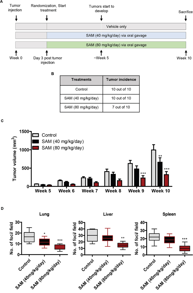 Figure 2: Effect of SAM on MDA-MB-231 tumor growth and metastasis. (A) Schematic representation of SAM-treatment in MDA-MB-231 tumor xenograft mice. Female CD1 mice inoculated with MDA-MD-231-GFP cells via orthotopic route were randomized, and treatment with SAM at different doses was started from day three post tumor cell inoculation. Animals were treated daily with vehicle alone or SAM (40 mg/kg/day or 80 mg/kg/day) via daily oral gavage. (B) Tabular representation of the incidence of tumor in control and two experimental groups. (C) Tumor volume was determined at weekly intervals from week 5 when the animals started to develop tumors. Treatment with SAM caused a significant dose-dependent decrease in tumor growth. Results are representative of mean ± SEM of tumor volumes obtained from at least seven animals per group. Significant differences were determined using ANOVA followed by post hoc Bonferroni test and are represented by asterisks. (**P < 0.01; ***P < 0.001). (D) To evaluate the effect of SAM on tumor metastasis, control and SAM (40 and 80 mg/kg/day) treated animals were sacrificed at week 10 and different organs (lung, liver, spleen) were collected. Organ slices of 1-mm thickness were mounted on a glass slide, and the GFP-positive foci were examined under the fluorescent microscope. Ten randomly selected slides were counted and averaged to determine the GFP-positive metastatic foci in each organ. Significant differences were determined using ANOVA followed by post hoc Bonferroni test and are represented by asterisks. (*P < 0.05; **P < 0.01, and ***P < 0.001).
