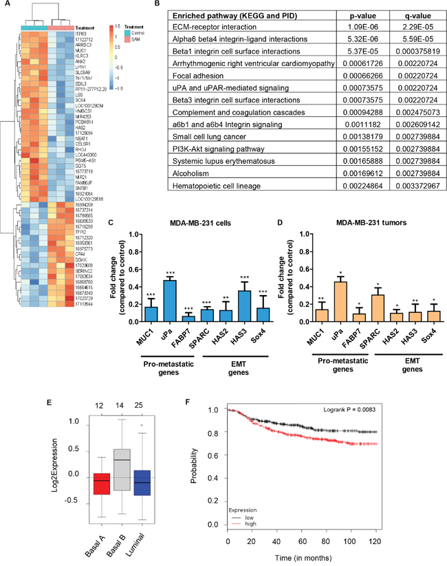 Figure 3: Gene expression analysis of MDA-MB-231 cells and tumors treated with SAM. (A) MDA-MB-231 cells from control and SAM-treated (200 μM) group were subjected to Affymetrix array and the heat map of the most differentially expressed genes are shown (n=3 in each group). (B) Pathway analysis (from KEGG and PID database) of the genes that are differentially expressed upon SAM-treatment. (C) Selected genes differentially regulated by SAM were validated by quantitative real-time PCR (qPCR) in MDA-MB-231 cells. Results are shown as mean ± SEM of at least three independent experiments. (**P < 0.01, and ***P < 0.001). (D) RNA obtained from the tumor of control and 80 mg/kg/day SAM-treated animals were subjected to qPCR for the same set of genes that showed downregulation by SAM in vitro. Results are shown as mean ± SEM of at least three independent animals per group. (*P < 0.05 and ** P < 0.01). (E) Gene Set Analysis (GSA) representing the expression of these genes in human breast cancer cell lines. (F) Kaplan-Meier plot of distant metastasis free survival from a dataset of 664 breast cancer patients categorized according to the expression of the seven down-regulated genes in Figure 3D.