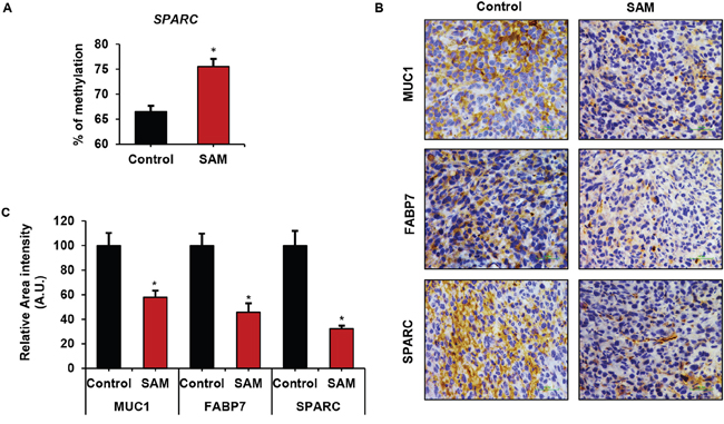 Figure 4: Effect of SAM-treatment on promoter methylation and protein expression of cancer-related genes. (A) Site-specific methylation analysis by pyrosequencing at the promoter of SPARC (location: chromosome 5: 151066730; corresponding to Illumina 450K ID: cg22116670). (B) Immunohistochemistry of control and SAM-treated tumors using antibodies against MUC1, FABP7 and SPARC proteins. (C) The stained areas were quantified using Fiji plugin (ImageJ). Results are shown as mean ± SEM (n=3). *P < 0.05.