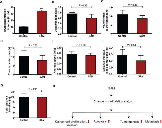 Figure 5: Assessment of bioavailability and animal behavior upon SAM-treatment. (A) The average level of SAM in control and the experimental group receiving 80 mg/kg/day ofSAM as determined by the SAM ELISA. Results are obtained from the analysis of serum from four animals in each group. (***P < 0.001). (B) Novel object recognition test of control and SAM-treated mice. Average Discrimination ratio (time spent with the novel object/ total time spent with both object). No significant differences in cognitive abilities are detected between control and SAM-treated groups. (C-G) Different parameters determined by the open field test of control and SAM-treated mice also showed no significant difference between control and SAM-treated animals. Results are shown as mean ± SEM (n=3 for each group of CD-1 nude mice), and statistical analyses were done using student’s t-test. (H) A summary of biological processes shown to be affected by SAM as determined in this study includes cell proliferation, invasion, apoptosis in vitro and tumorigenesis and metastasis in vivo.