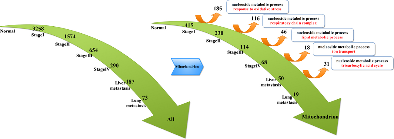 By analyzing continuously suppressed genes (Figure 2), we obtained the following results: compared to the normal tissue, 3258 genes were down-regulated at stage I and 1547 genes were down-regulated at stage II. Moreover, 654 genes were down-regulated at stage III and 290 genes were down-regulated at stage IV. There were 187 down-regulated genes at liver metastases stage, and 73 down-regulated genes were detected at lung metastases stage. Throughout the analysis, we found that most of the genes were located in the mitochondria. Therefore, we extracted genes that belong to the mitochondria from the suppressed genes in each stages of CRC. These genes from the mitochondria were further classified as suppressed genes and deviated genes at each stage of CRC: compared to the normal tissue, there were 415 down-regulated genes at stage I and 185 deviated genes, whereas 230 genes remained down-regulated at stage II but 116 genes had deviated. Moreover, 114 down-regulated genes remained at stage III but 46 genes had deviated. There were 68 down-regulated genes at stage IV and 18 genes had deviated. There were 50 genes remained down-regulated at liver metastases stage but 31 genes had deviated. Finally, Only 19 genes remained down-regulated at lung metastases stage. Since deviated genes of each stage reflected molecular events of each stage of tumor development, we used the biological processes in Gene Ontology to perform enrichment analysis of the genes that deviated from each stage. Thus, we detected nucleoside metabolic process at each stage. Besides the same molecular events, all the stages of tumor development also had their own characteristics: in stage I to stage II of CRC, molecular events mainly elicited oxidative stress response; in stage II to III of CRC, molecular events mainly included respiratory chain components; in the stage III to IV of CRC, molecular events mainly consisted of fatty acid metabolism; from stage IV to liver metastases, molecular events mainly included the transport of ions, especially cationic transport. In liver metastasis to lung metastasis, molecular events mainly included tricarboxylic acid cycle. As the CRC developed and progressed to later stages, there was a decrease in the number of continuously suppressed genes. Consequently, the number of deviated genes also decreased simultaneously; therefore, in the late stages of CRC tumor, the molecular events could only reflect changes in the expression of a few genes.