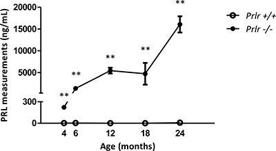 Figure 1: Blood PRL measurements in Prlr–/– mice compared to Prlr+/+ mice. Measurements were performed at 4, 6, 12, 18 and 24 months of age (n = 6 in each group). Mean ± SEM levels of PRL in mice of both genotypes **p < 0.01.
