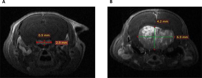Figure 2: Coronal T1 weighted post-gadolinium enhanced Magnetic Resonance Imaging scans in Prlr+/+ and Prlr–/– 18-month-old female mice. (A) Normal pituitary gland in a Prlr+/+ mouse. Pituitary measured 2.9 × 0.9 mm, with a homogeneous signal after gadolinium injection. (B) Representative pituitary imaging in a Prlr–/– mouse revealing heterogenous T1 enhanced pituitary macroadenoma of 6.9 × 4.2 mm of diameter with cerebral mass effect.