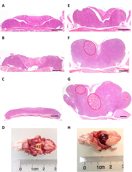 Figure 3: Pituitary enlargement in Prlr–/– compared to Prlr+/+ mice. Representative histological sections from Prlr+/+ of 4 (A), 12 (B), 18-month-old (C) and Prlr–/– female mice of 4 (E), 12 (F) and 18 month-old (G). Red ellipses indicate cystic spaces and hypervascularisation. Bar scale = 500 μm. Macroscopical view of pituitary (yellow circle) of 24 month-old Prlr+/+ (D) and Prlr–/– (H) female mice.