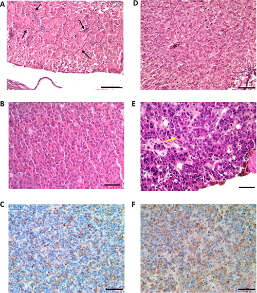 Figure 4: Histological analysis of anterior pituitaries from 24 month-old Prlr+/+ and Prlr–/– mice. Top row shows Gordon–Sweet silver staining in pituitaries sections of Prlr+/+ (A) and Prlr–/– (D) mice. Black arrows indicate reticulin fibers. Middle row shows hematoxylin and eosin-stained pituitary sections of Prlr+/+ (B) and Prlr–/– (E) mice. The wild-type pituitary has a normal architecture and mixture of cells (B). The Prlr–/– genotype exhibits peliosis (extravasated erythrocytes not contained in capillaries) and lactotrophs with very large Golgi regions and scattered, large, hyperchromatic, atypical nuclei. Yellow arrow indicates mitosis (E). Bottom row: PRL immunohistochemistry. The wild-type pituitary (C) contains a few mature active lactotroph cells with PRL immunostaining. Almost all the cells in the Prlr–/– pituitary (F) are active lactotrophs with PRL immunoreactivity. Bar scale = 50 μm.