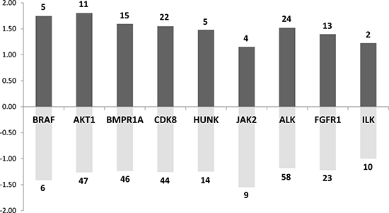 Figure 5: Main kinases whose known targets are dysregulated in both rat and mouse models. Dark grey bar charts indicate for each kinase the mean fold change of up-regulated target genes. Pale grey bar charts indicate for each kinase the mean fold change of down-regulated target genes. The number of up or down-regulated target genes for each kinase are indicated in the bar charts.