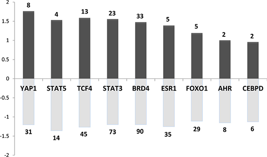 Figure 6: Main transcription factors (TF) whose known targets are dysregulated in both rat and mouse models. Dark and pale grey bar charts indicate for each TF the mean fold change of up and down regulated target genes respectively. The number regarding the bar chart indicates the number of up or down-regulated target genes for each TF.