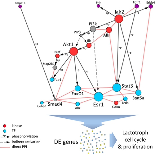 In order to gain insights into the interplay between those various regulators (namely, kinases and TFs), we built a network, by retrieving known direct protein-protein interactions (i.e., interactome) among them using Cytoscape. Interestingly, when using this list of 18 kinases and TFs as input, 16 appeared directly connected to at least another regulator (Figure 7). Moreover, several of the TFs are known to be phosphorylated by at least one of the kinases. This network highlights the strong interplay between the potential effectors of PRLR, both at the kinases and FTs levels, to coordinate the transcriptomic response observed in the two rodent models.