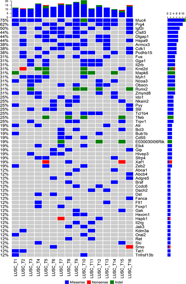 Figure 1: Profiles of recurrently mutated cancer genes in mouse LUSC tumors. The non-silent somatic mutation spectrum of the 59 cancer genes that were recurrently mutated in the 16 mice LUSC tumors was plotted. The order of genes was sorted by the mutation frequency decreasingly. The top bar plot showed the total number of mutations in any of the 59 genes per sample, the right-side and the left-side legends showed the number and frequency of mutations within each gene across the 16 mouse LUSC tumors.